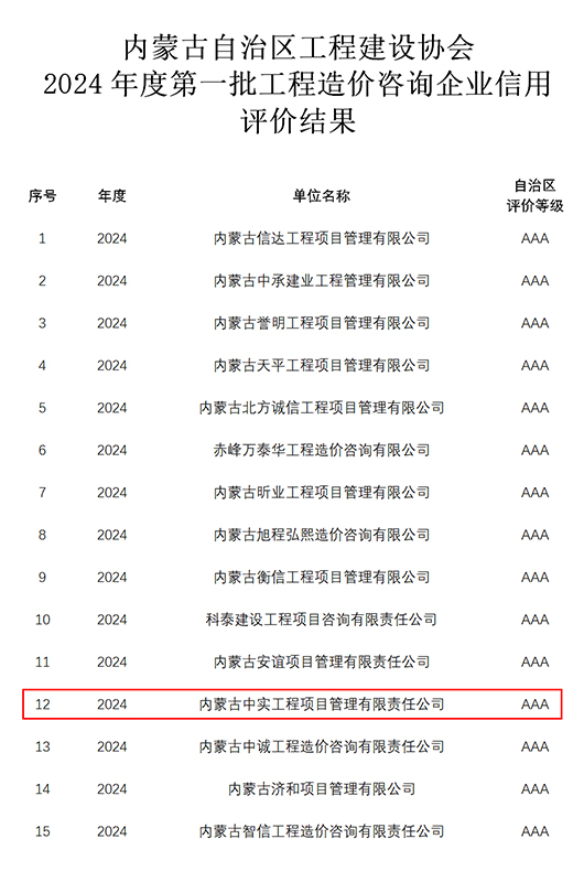 2024-07-3014828 次近期,我公司参加内蒙古自治区工程建设协会组织的“2024年度第一批工程造价咨询企业信用”申报,获得“信用AAA级证书”。我公司成立多年以来,遵循中国工程造价管理协会对造价咨询企…